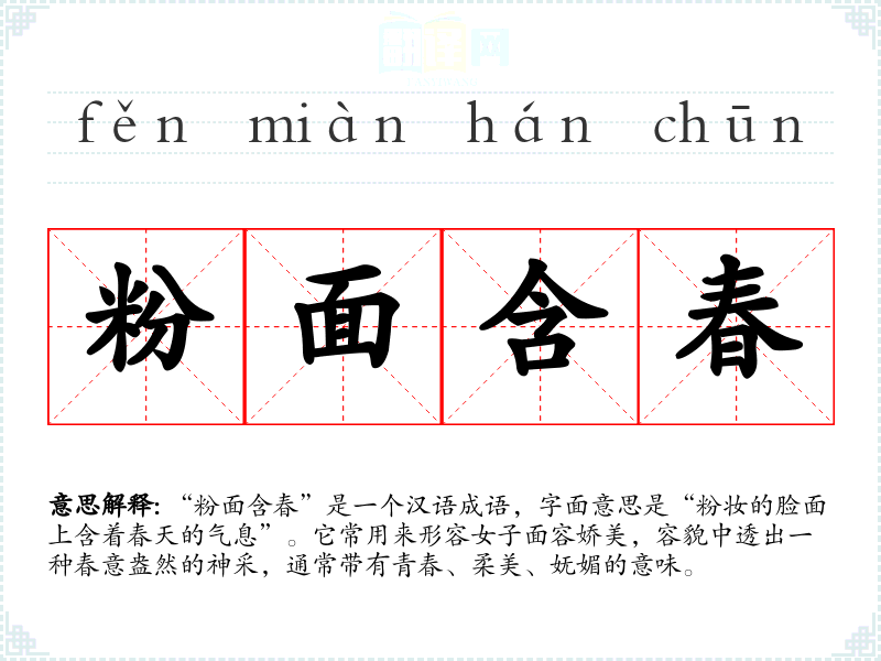 “粉面含春”是一个汉语成语,字面意思是“粉妆的脸面上含着春天的气息”。它常用来形容女子面容娇美,容貌中透出一种春意盎然的神采,通常带有青春、柔美、妩媚的意味。