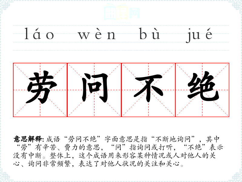成语“劳问不绝”字面意思是指“不断地询问”,其中“劳”有辛苦、费力的意思,“问”指询问或打听,“不绝”表示没有中断。整体上,这个成语用来形容某种情况或人对他人的关心、询问非常频繁,表达了对他人状况的关注和关心。