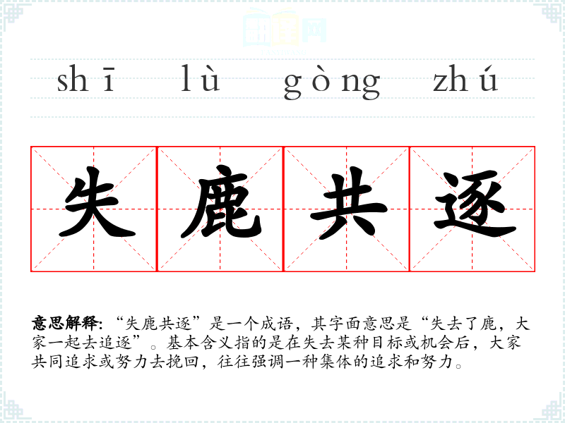 “失鹿共逐”是一个成语,其字面意思是“失去了鹿,大家一起去追逐”。基本含义指的是在失去某种目标或机会后,大家共同追求或努力去挽回,往往强调一种集体的追求和努力。