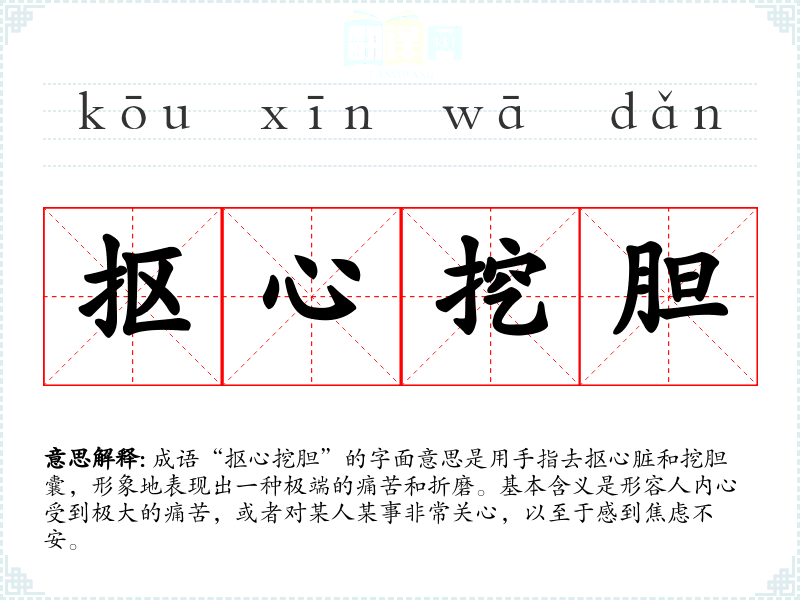 - 反义成语:心安理得、泰然自若,表示内心的平和与安宁,与“抠心挖胆”形成鲜明对比。