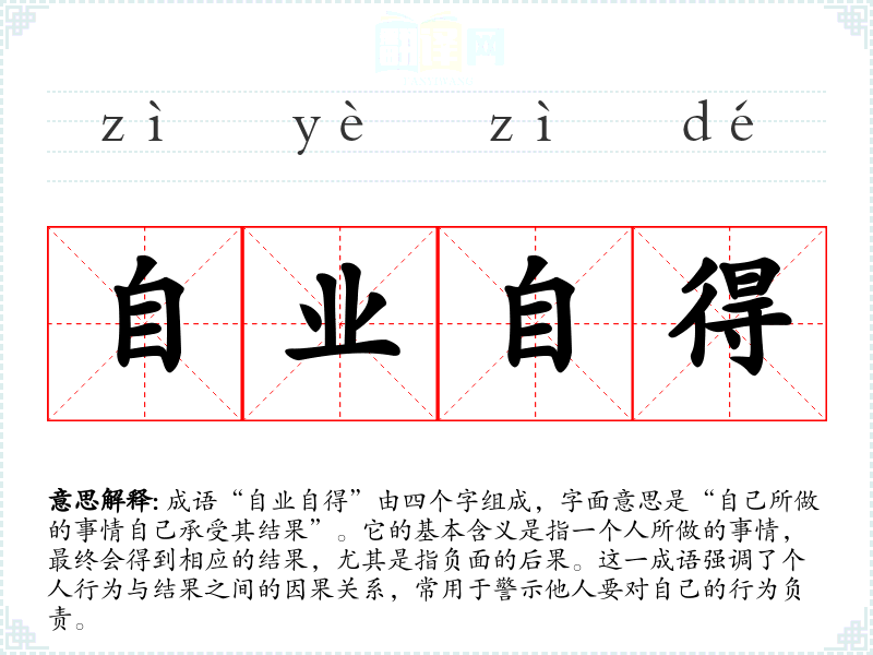 成语“自业自得”由四个字组成,字面意思是“自己所做的事情自己承受其结果”。它的基本含义是指一个人所做的事情,最终会得到相应的结果,尤其是指负面的后果。这一成语强调了个人行为与结果之间的因果关系,常用于警示他人要对自己的行为负责。