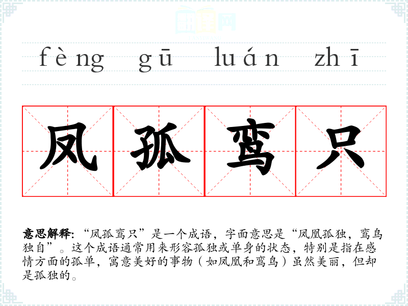 “凤孤鸾只”是一个成语,字面意思是“凤凰孤独,鸾鸟独自”。这个成语通常用来形容孤独或单身的状态,特别是指在感情方面的孤单,寓意美好的事物(如凤凰和鸾鸟)虽然美丽,但却是孤独的。