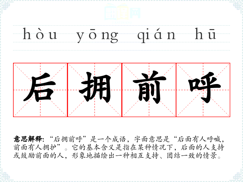 “后拥前呼”是一个成语,字面意思是“后面有人呼喊,前面有人拥护”。它的基本含义是指在某种情况下,后面的人支持或鼓励前面的人,形象地描绘出一种相互支持、团结一致的情景。