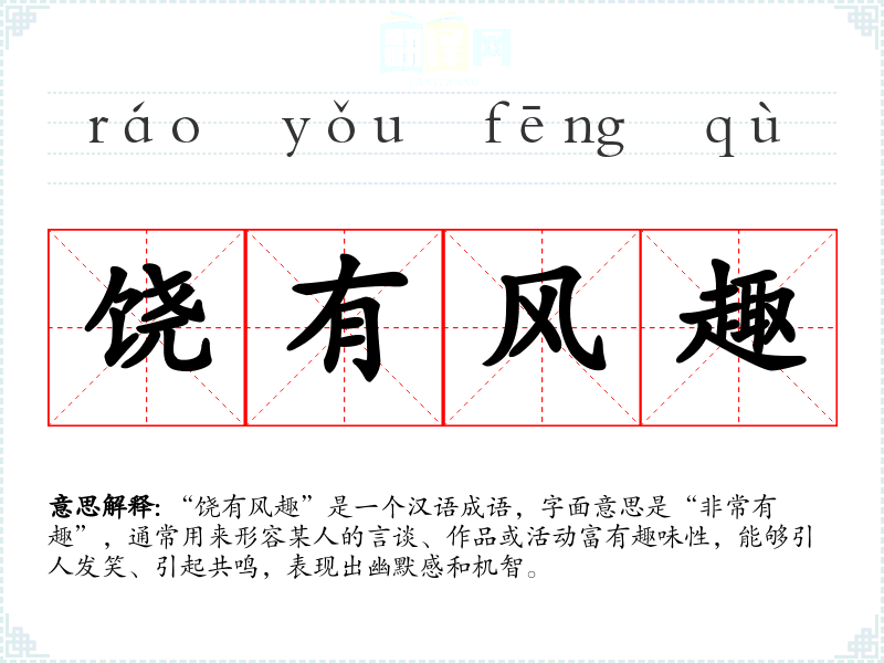 “饶有风趣”是一个汉语成语,字面意思是“非常有趣”,通常用来形容某人的言谈、作品或活动富有趣味性,能够引人发笑、引起共鸣,表现出幽默感和机智。