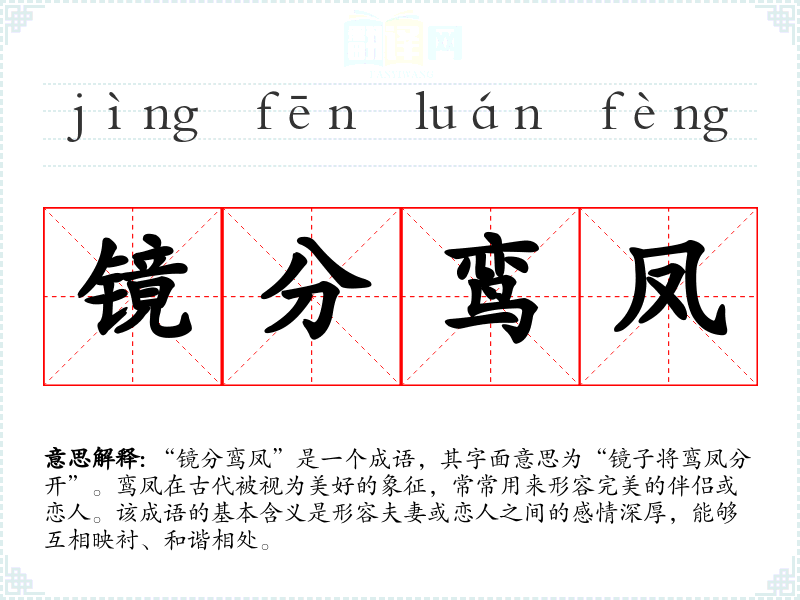 “镜分鸾凤”是一个成语,其字面意思为“镜子将鸾凤分开”。鸾凤在古代被视为美好的象征,常常用来形容完美的伴侣或恋人。该成语的基本含义是形容夫妻或恋人之间的感情深厚,能够互相映衬、和谐相处。