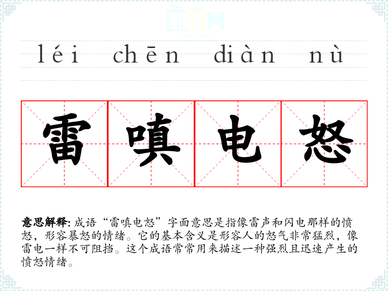 - 同义成语:怒火中烧、暴跳如雷,都是形容愤怒的成语,但“雷嗔电怒”更加强调雷电的迅猛和不可阻挡。