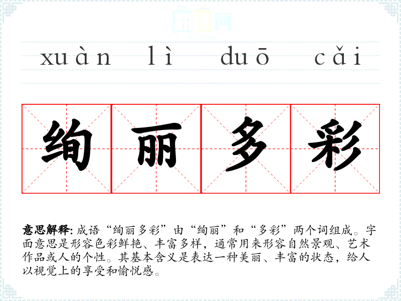 “绚丽多彩”并没有明确的历史典故或古文出处,但它的构成词“绚丽”与“多彩”在汉语中都有着悠久的使用历史。绚丽通常指光彩夺目的样子,而多彩则强调色彩的多样性。成语的形成反映了**语言的丰富性和表达的细腻。