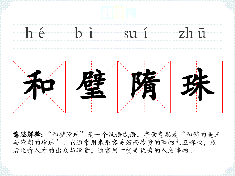 “和璧隋珠”是一个汉语成语,字面意思是“和谐的美玉与隋朝的珍珠”。它通常用来形容美好而珍贵的事物相互辉映,或者比喻人才的出众与珍贵,通常用于赞美优秀的人或事物。