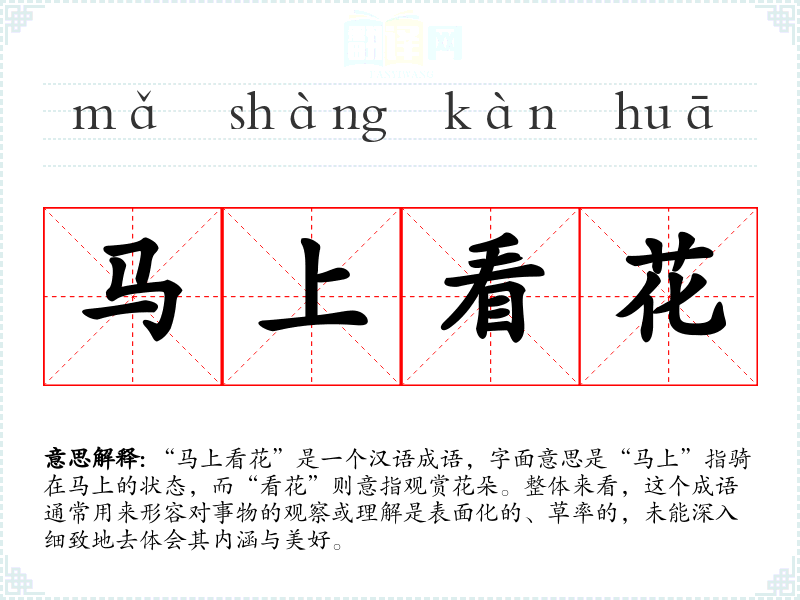 该成语的具体来源尚不明确,可能是民间口头流传的结果。它的构成中包含了“马上”这一时间概念,强调了观察的匆忙和表面化;而“看花”则暗示了事物的表象与表面美。因此,成语反映了**传统文化中对事物深度理解的重视。