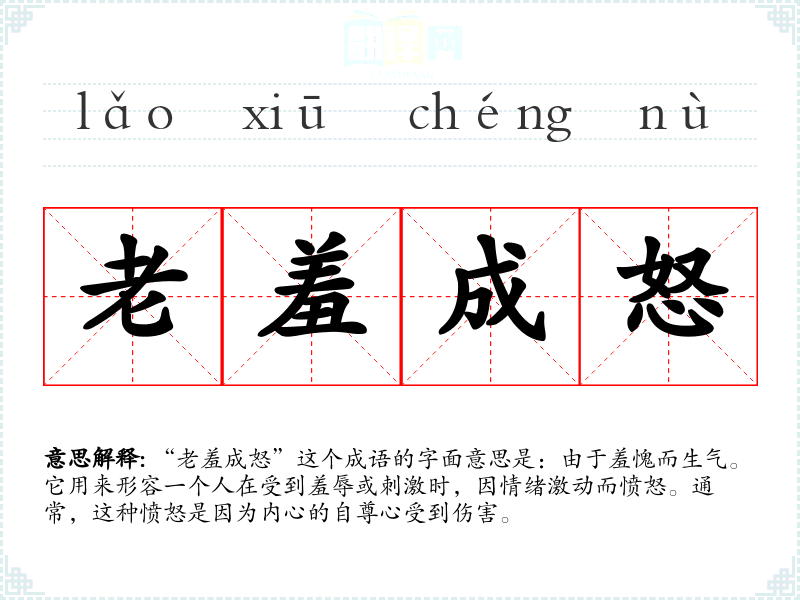 “老羞成怒”这个成语的字面意思是:由于羞愧而生气。它用来形容一个人在受到羞辱或刺激时,因情绪激动而愤怒。通常,这种愤怒是因为内心的自尊心受到伤害。