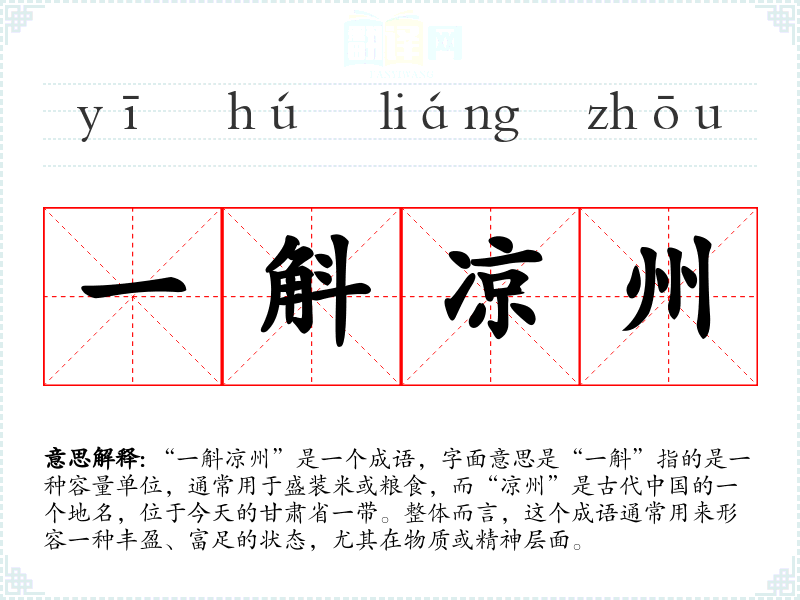 在古代**,凉州是一个重要的交通和贸易枢纽,象征着富饶和繁荣。因此,成语“一斛凉州”承载了传统文化中对物质富足和精神满足的追求。在现代社会,尽管物质条件有所改善,但这一成语仍可用于表达对生活质量的向往。