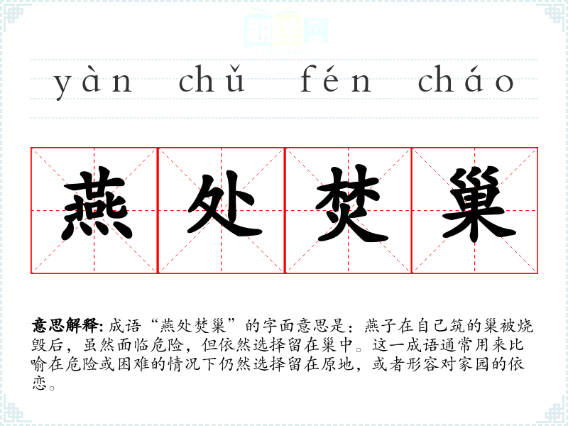 成语“燕处焚巢”的字面意思是:燕子在自己筑的巢被烧毁后,虽然面临危险,但依然选择留在巢中。这一成语通常用来比喻在危险或困难的情况下仍然选择留在原地,或者形容对家园的依恋。