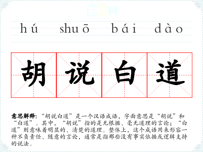 “胡说白道”是一个汉语成语,字面意思是“胡说”和“白道”。其中,“胡说”指的是无根据、毫无道理的言论;“白道”则意味着明显的、清楚的道理。整体上,这个成语用来形容一种不负责任、随意的言论,通常是指那些没有事实依据或逻辑支持的说法。