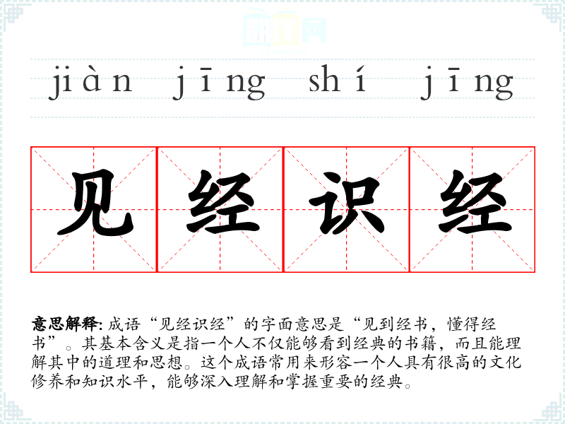 成语“见经识经”的字面意思是“见到经书,懂得经书”。其基本含义是指一个人不仅能够看到经典的书籍,而且能理解其中的道理和思想。这个成语常用来形容一个人具有很高的文化修养和知识水平,能够深入理解和掌握重要的经典。