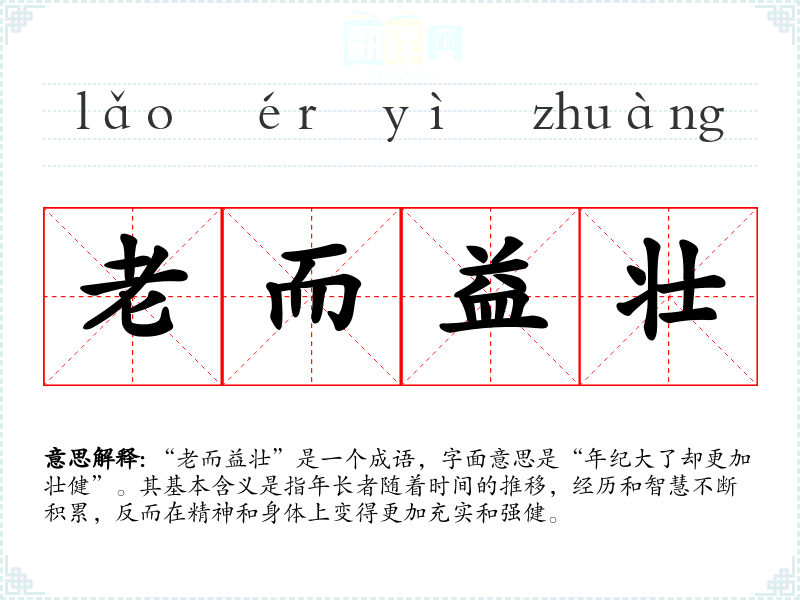 “老而益壮”是一个成语,字面意思是“年纪大了却更加壮健”。其基本含义是指年**随着时间的推移,经历和智慧不断积累,反而在精神和身体上变得更加充实和强健。