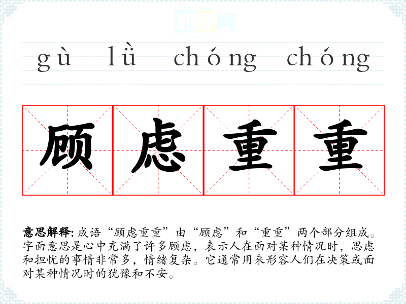 “顾虑重重”并没有明确的文学出处,但其构成中的“顾虑”一词在古汉语中常用于表达人们的担忧和思虑,而“重重”则表示数量繁多、层次复杂。该成语反映了**文化中对于人际关系和决策过程中谨慎态度的重视,体现了人们在面对选择时的心理状态。