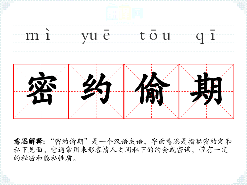 “密约偷期”是一个汉语成语,字面意思是指秘密约定和私下见面。它通常用来形容情人之间私下的约会或密谋,带有一定的秘密和隐私性质。