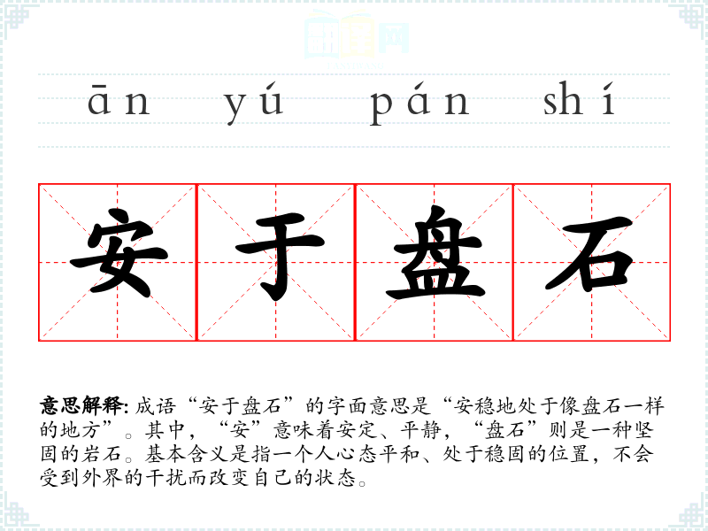 成语“安于盘石”的字面意思是“安稳地处于像盘石一样的地方”。其中,“安”意味着安定、平静,“盘石”则是一种坚固的岩石。基本含义是指一个人心态平和、处于稳固的位置,不会受到外界的干扰而改变自己的状态。