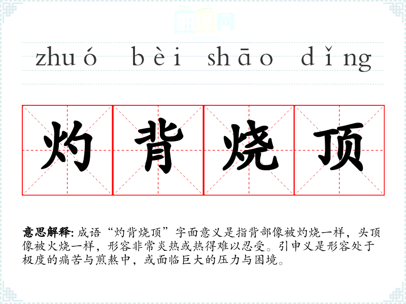 成语“灼背烧顶”字面意义是指背部像被灼烧一样,头顶像被火烧一样,形容非常炎热或热得难以忍受。引申义是形容处于极度的痛苦与煎熬中,或面临巨大的压力与困境。