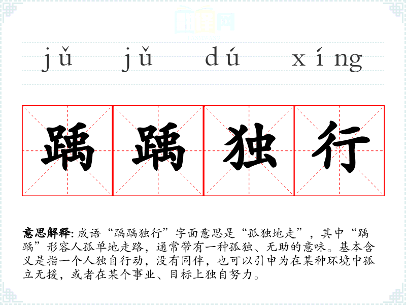 成语“踽踽独行”字面意思是“孤独地走”,其中“踽踽”形容人孤单地走路,通常带有一种孤独、无助的意味。基本含义是指一个人独自行动,没有同伴,也可以引申为在某种环境中孤立无援,或者在某个事业、目标上独自努力。
