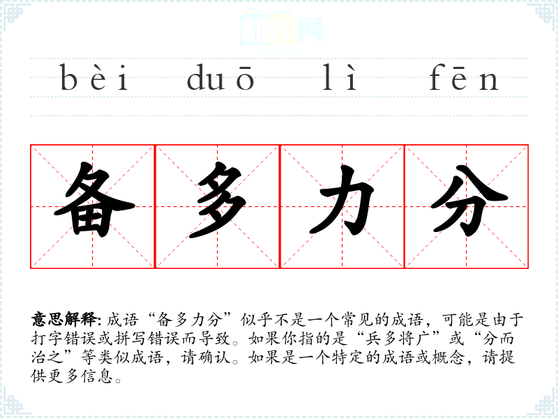 成语“备多力分”似乎不是一个常见的成语,可能是由于打字错误或拼写错误而导致。如果你指的是“兵多将广”或“分而治之”等类似成语,请确认。如果是一个特定的成语或概念,请提供更多信息。