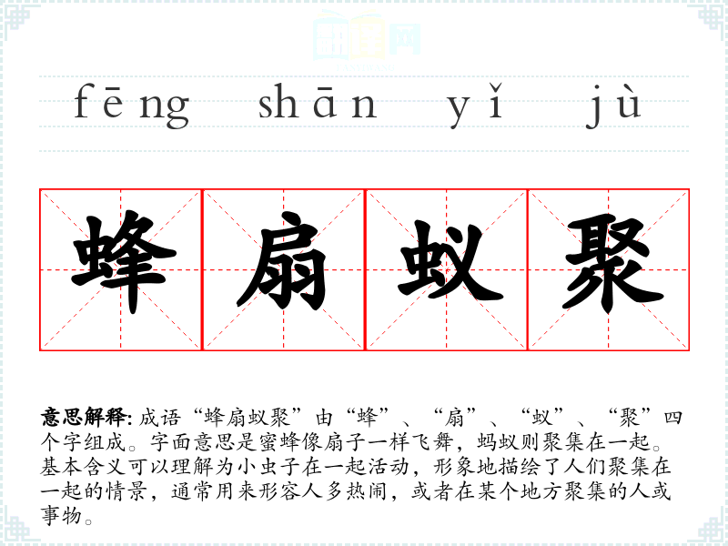 成语“蜂扇蚁聚”由“蜂”、“扇”、“蚁”、“聚”四个字组成。字面意思是蜜蜂像扇子一样飞舞,蚂蚁则聚集在一起。基本含义可以理解为小虫子在一起活动,形象地描绘了人们聚集在一起的情景,通常用来形容人多热闹,或者在某个地方聚集的人或事物。