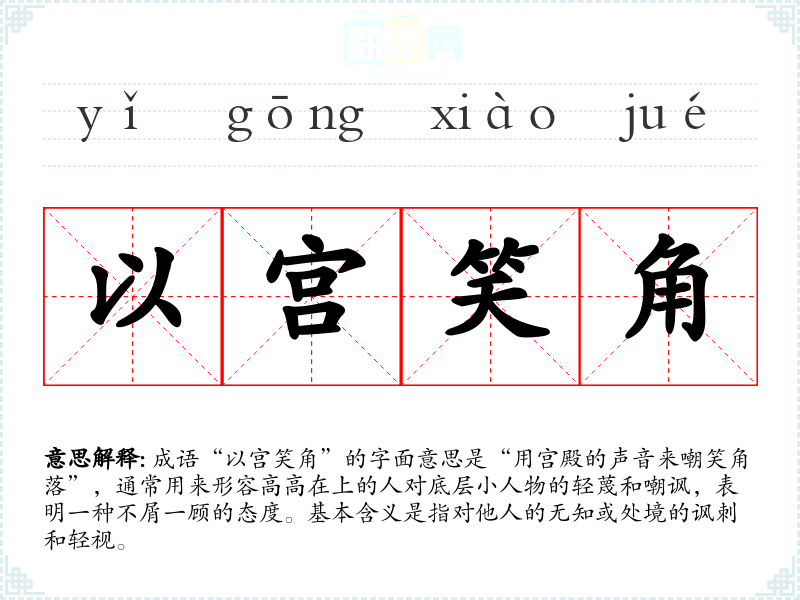 成语“以宫笑角”的字面意思是“用宫殿的声音来嘲笑角落”,通常用来形容高高在上的人对底层小人物的轻蔑和嘲讽,表明一种不屑一顾的态度。基本含义是指对他人的无知或处境的讽刺和轻视。
