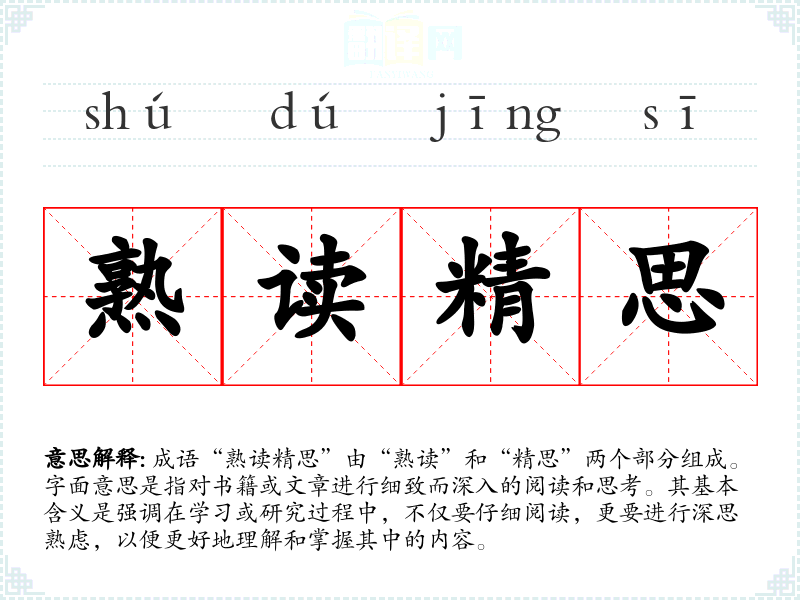成语“熟读精思”由“熟读”和“精思”两个部分组成。字面意思是指对书籍或文章进行细致而深入的阅读和思考。其基本含义是强调在学*或研究过程中,不仅要仔细阅读,更要进行深思熟虑,以便更好地理解和掌握其中的内容。