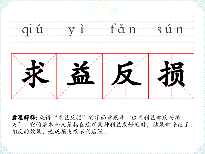 成语“求益反损”的字面意思是“追求利益却反而损失”。它的基本含义是指在追求某种利益或好处时,结果却导致了相反的效果,造成损失或不利后果。