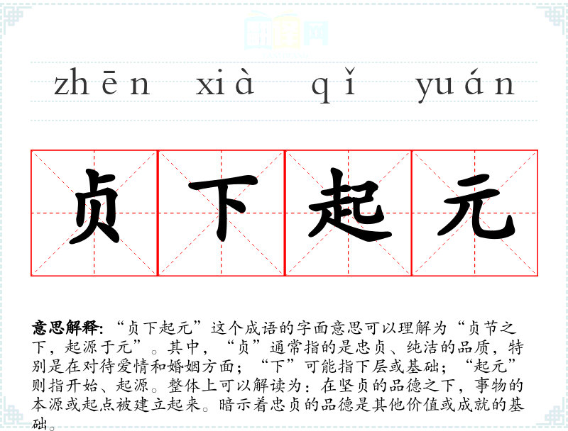 “贞下起元”这个成语的字面意思可以理解为“贞节之下,起源于元”。其中,“贞”通常指的是忠贞、纯洁的品质,特别是在对待爱情和婚姻方面;“下”可能指下层或基础;“起元”则指开始、起源。整体上可以解读为:在坚贞的品德之下,事物的本源或起点被建立起来。暗示着忠贞的品德是其他价值或成就的基础。