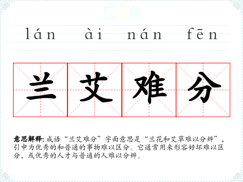 成语“兰艾难分”字面意思是“兰花和艾草难以分辨”,引申为优秀的和普通的事物难以区分。它通常用来形容好坏难以区分,或优秀的人才与普通的人难以分辨。