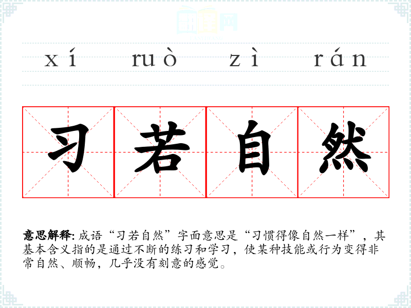 成语“若自然”字面意思是“惯得像自然一样”,其基本含义指的是通过不断的练和学,使某种技能或行为变得非常自然、顺畅,几乎没有刻意的感觉。