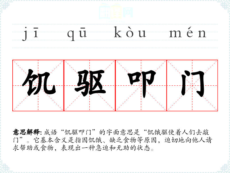成语“饥驱叩门”的字面意思是“饥饿驱使着人们去敲门”。它基本含义是指因饥饿、缺乏食物等原因,迫切地向他人请求帮助或食物,表现出一种急迫和无助的状态。