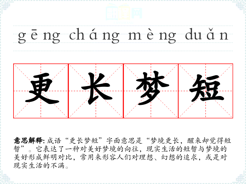 成语“更长梦短”字面意思是“梦境更长,醒来却觉得短暂”。它表达了一种对美好梦境的向往,现实生活的短暂与梦境的美好形成鲜明对比,常用来形容人们对理想、幻想的追求,或是对现实生活的不满。