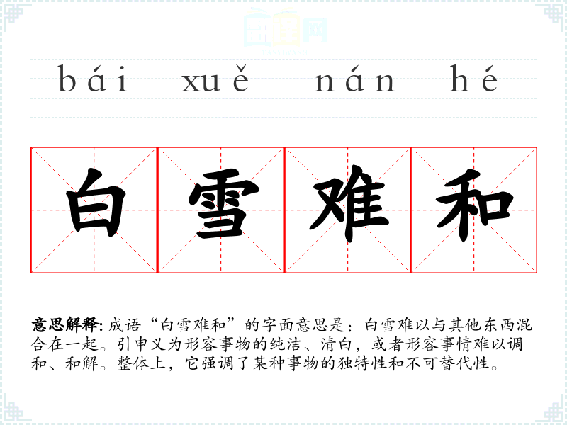 成语“白雪难和”的字面意思是:白雪难以与其他东西混合在一起。引申义为形容事物的纯洁、清白,或者形容事情难以调和、和解。整体上,它强调了某种事物的独特性和不可替代性。