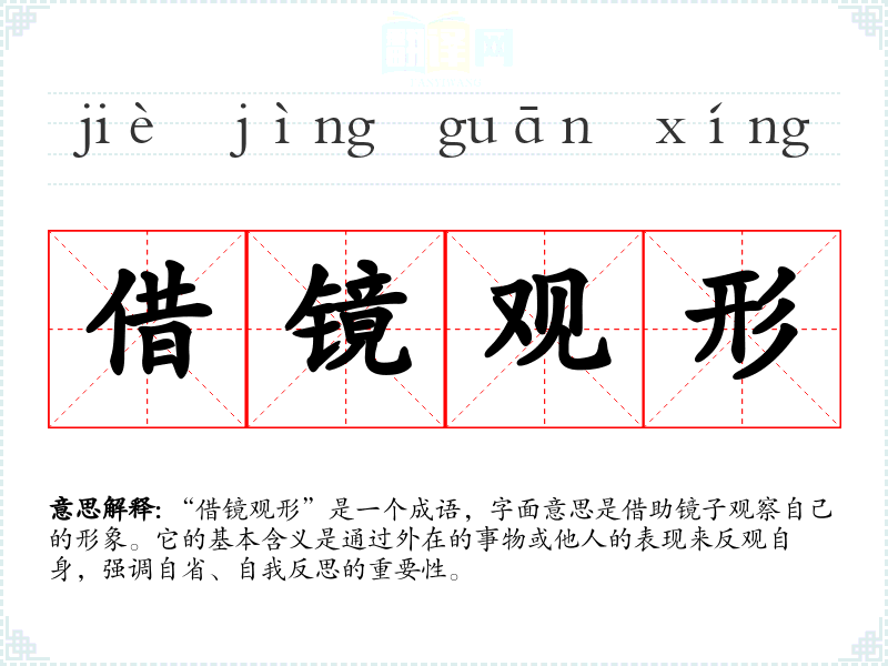“借镜观形”是一个成语,字面意思是借助镜子观察自己的形象。它的基本含义是通过外在的事物或他人的表现来反观自身,强调自省、自我反思的重要性。