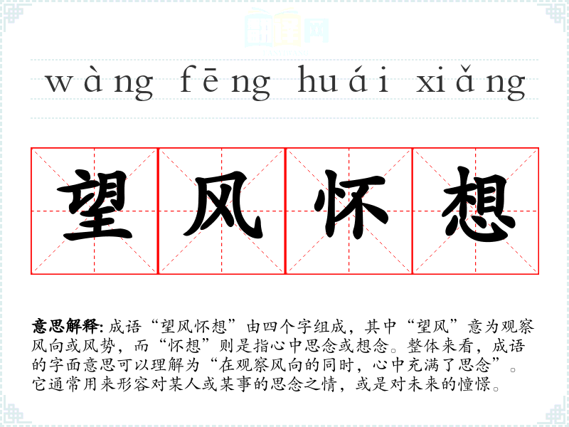 - 同义成语:思念、怀旧。它们都表达了对过去或某人的思念之情,但“望风怀想”更强调在观察自然时的情感流露。