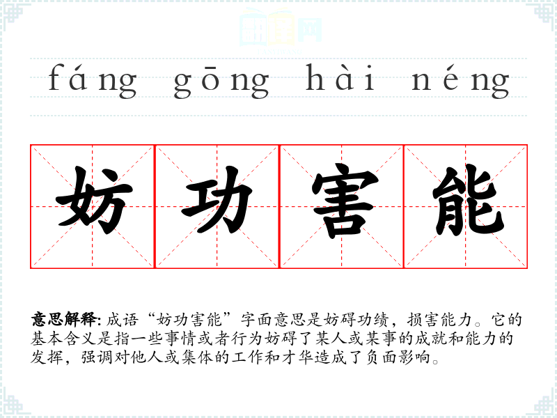 成语“妨功害能”字面意思是妨碍功绩,损害能力。它的基本含义是指一些事情或者行为妨碍了某人或某事的成就和能力的发挥,强调对他人或集体的工作和才华造成了负面影响。