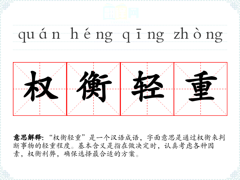“权衡轻重”是一个汉语成语,字面意思是通过权衡来判断事物的轻重程度。基本含义是指在做决定时,认真考虑各种因素,权衡利弊,确保选择最合适的方案。