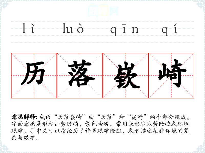 成语“历落嵚崎”由“历落”和“嵚崎”两个部分组成。字面意思是形容山势陡峭,景色险峻,常用来形容地势险峻或环境艰难。引申义可以指经历了许多艰难险阻,或者描述某种环境的复杂与艰难。