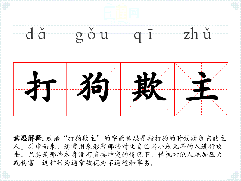 成语“打狗欺主”的字面意思是指打狗的时候欺负它的主人。引申而来,通常用来形容那些对比自己弱小或无辜的人进行攻击,尤其是那些本身没有直接冲突的情况下,借机对他人施加压力或伤害。这种行为通常被视为不道德和卑劣。