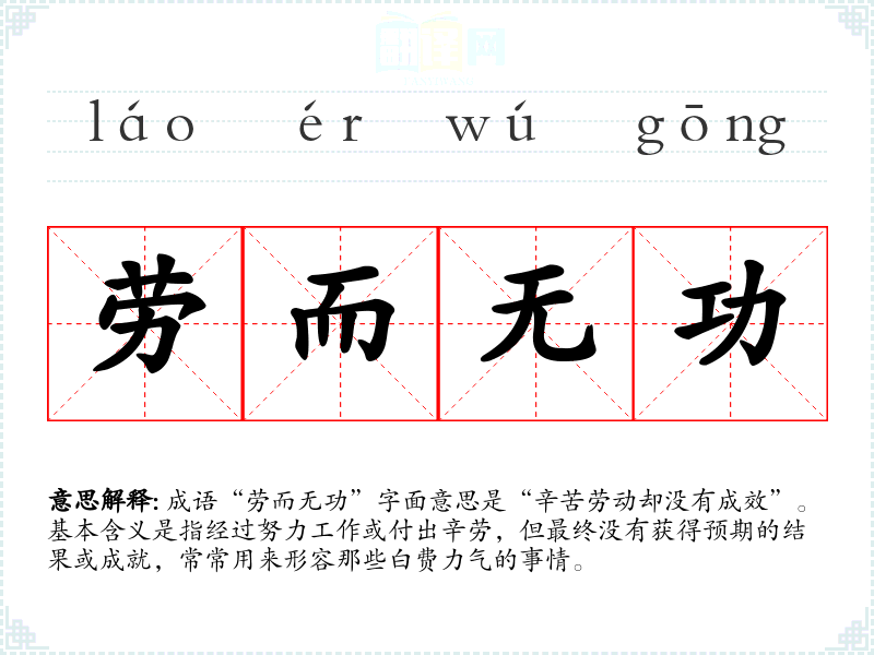 成语“劳而无功”字面意思是“辛苦劳动却没有成效”。基本含义是指经过努力工作或付出辛劳,但最终没有获得预期的结果或成就,常常用来形容那些白费力气的事情。