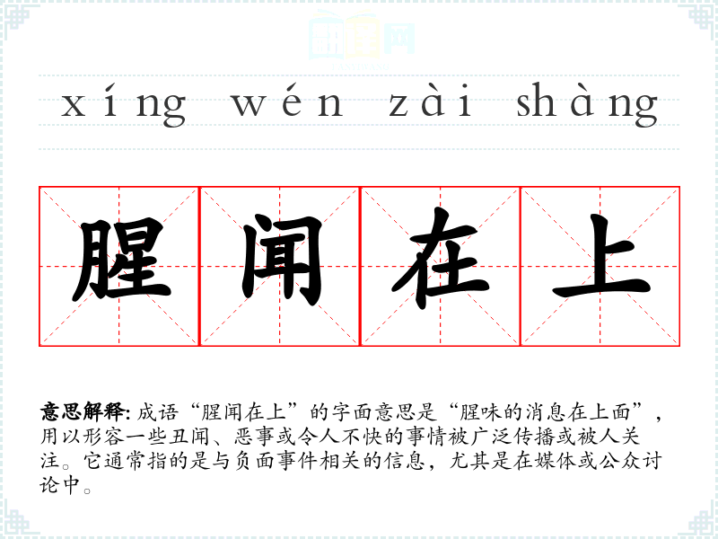 “腥闻在上”并不是一个传统的成语,而是一个现代汉语的表达,可能源于对一些负面新闻或丑闻的描述。在古代文学中,类似的概念常常以“闻”或“声”来表示,强调负面**的传播程度。