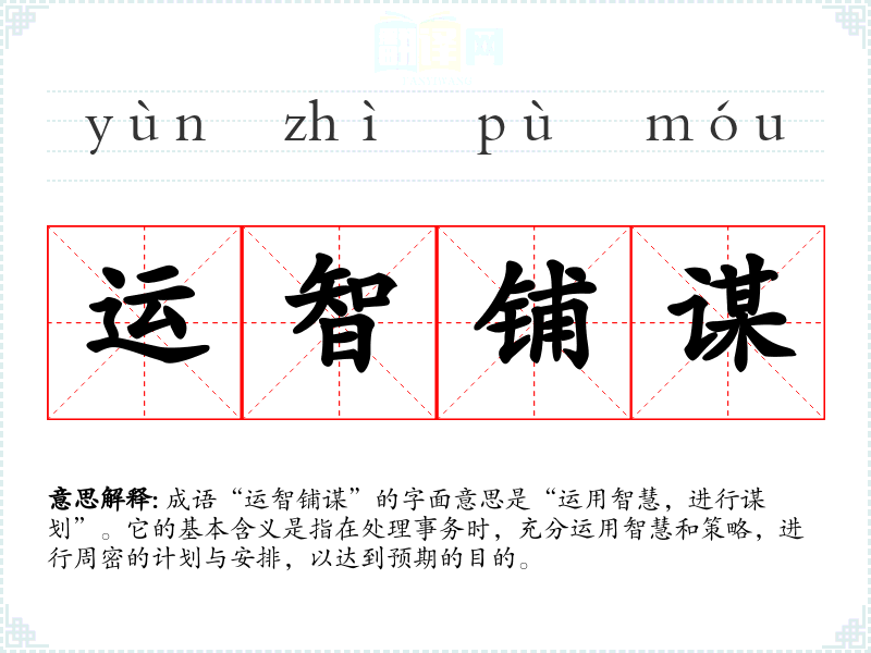 成语“运智铺谋”的字面意思是“运用智慧,进行谋划”。它的基本含义是指在处理事务时,充分运用智慧和策略,进行周密的计划与安排,以达到预期的目的。