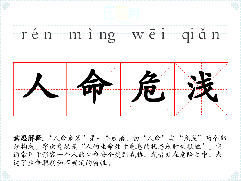“人命危浅”是一个成语,由“人命”与“危浅”两个部分构成。字面意思是“人的生命处于危急的状态或时刻很短”。它通常用于形容一个人的生命安全受到威胁,或者处在危险之中,表达了生命脆弱和不确定的特性。