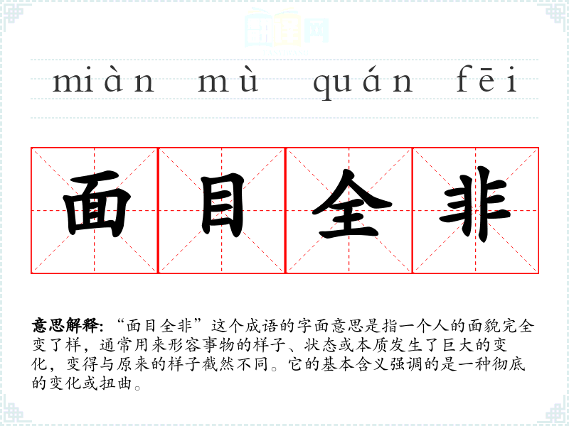 “面目全非”这个成语的字面意思是指一个人的面貌完全变了样,通常用来形容事物的样子、状态或本质发生了巨大的变化,变得与原来的样子截然不同。它的基本含义强调的是一种彻底的变化或扭曲。