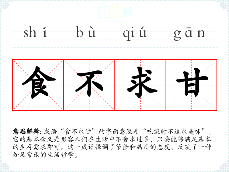 成语“食不求甘”的字面意思是“吃饭时不追求美味”。它的基本含义是形容人们在生活中不奢求过多,只要能够满足基本的生存需求即可。这一成语强调了节俭和满足的态度,反映了一种知足常乐的生活哲学。