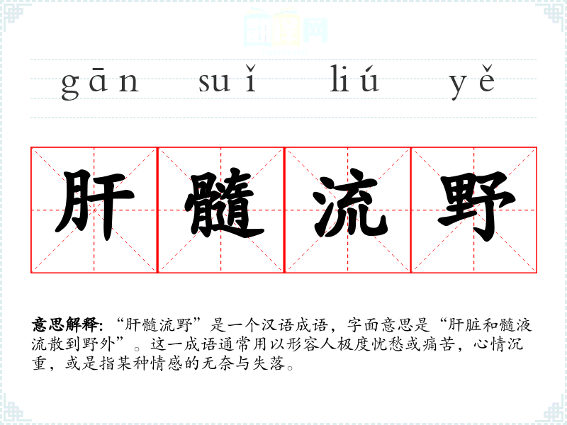 “肝髓流野”是一个汉语成语,字面意思是“肝脏和髓液流散到野外”。这一成语通常用以形容人极度忧愁或痛苦,心情沉重,或是指某种情感的无奈与失落。