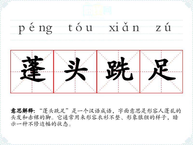 | 蓬头跣足 | 头发散乱,双脚赤裸。形容人衣冠不整的样子。 |