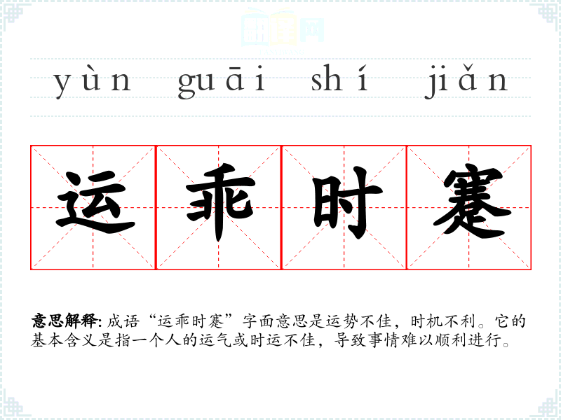 成语“运乖时蹇”字面意思是运势不佳,时机不利。它的基本含义是指一个人的运气或时运不佳,导致事情难以顺利进行。